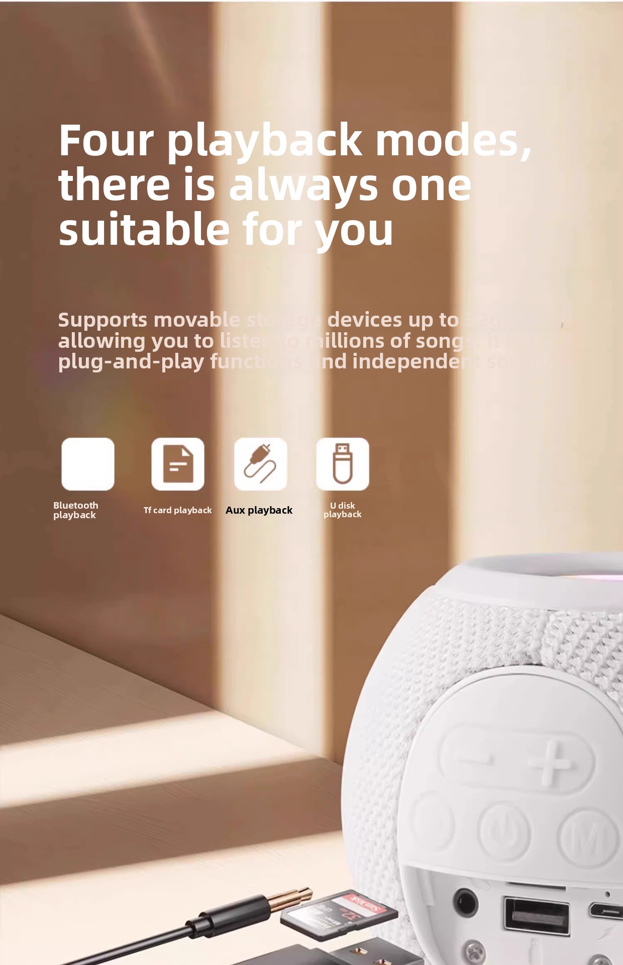 Multi-Function: Supports Bluetooth, TF card, AUX input, alarm, and voice prompts.