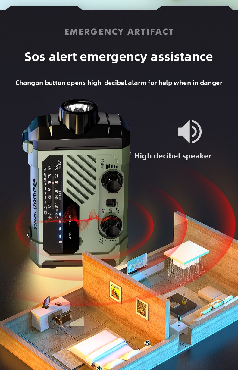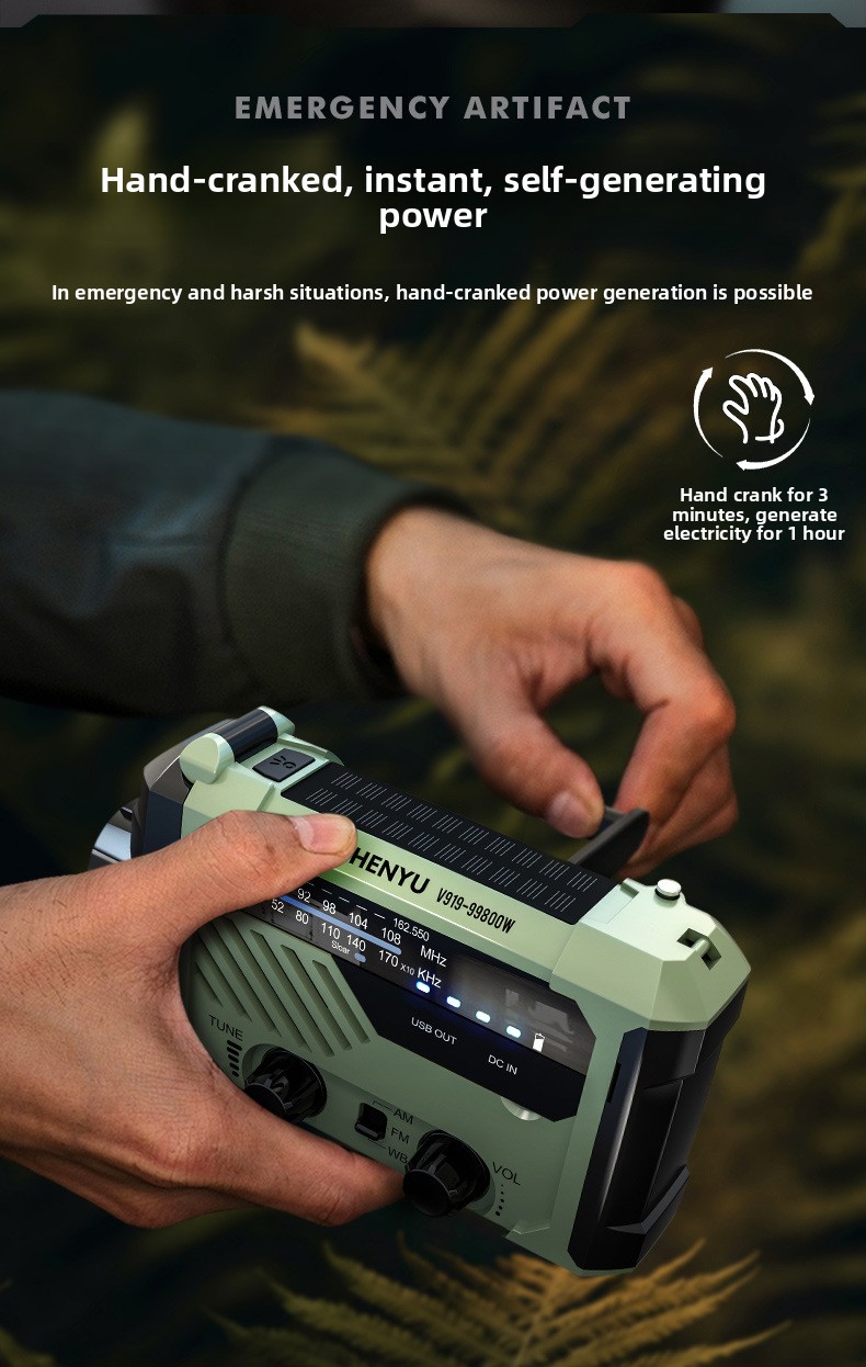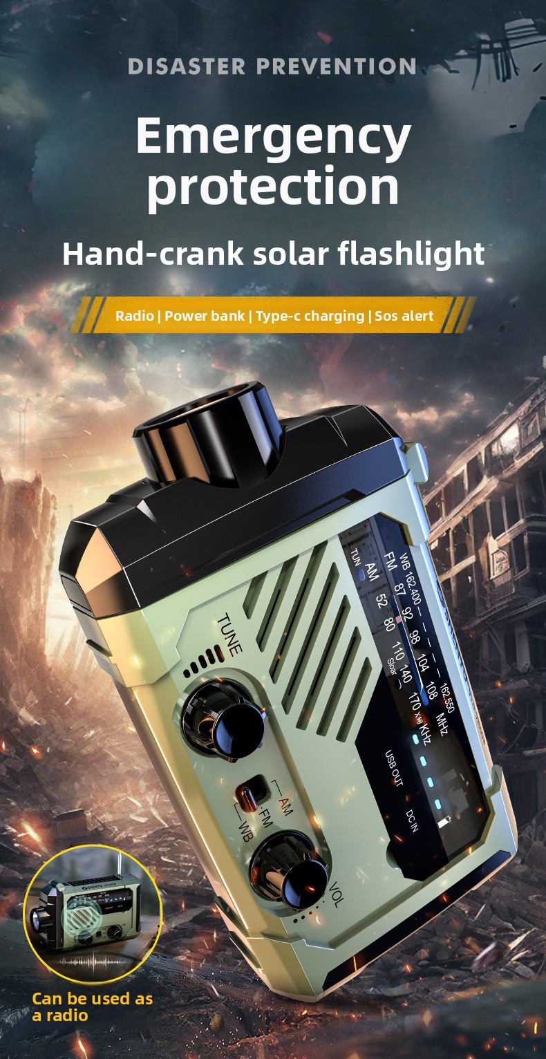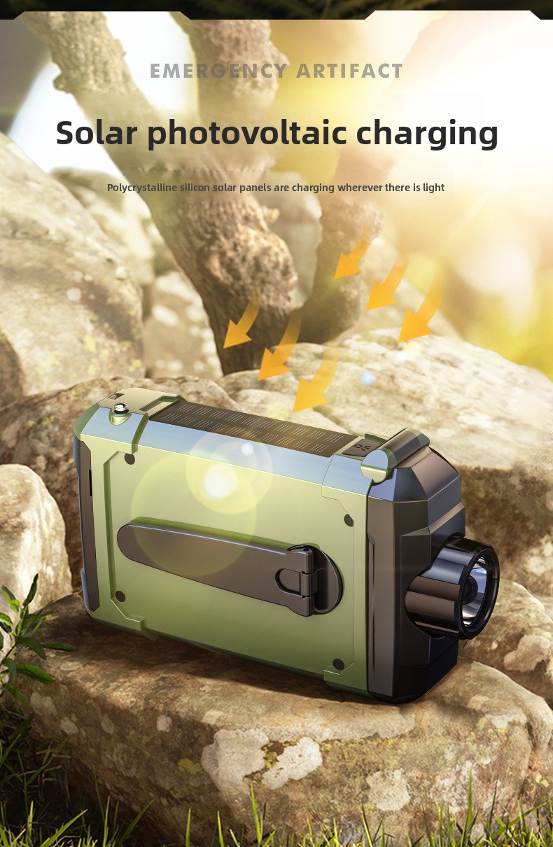 Multi-power charging: Hand crank, solar, Type-C, and AAA battery options for versatile energy sources