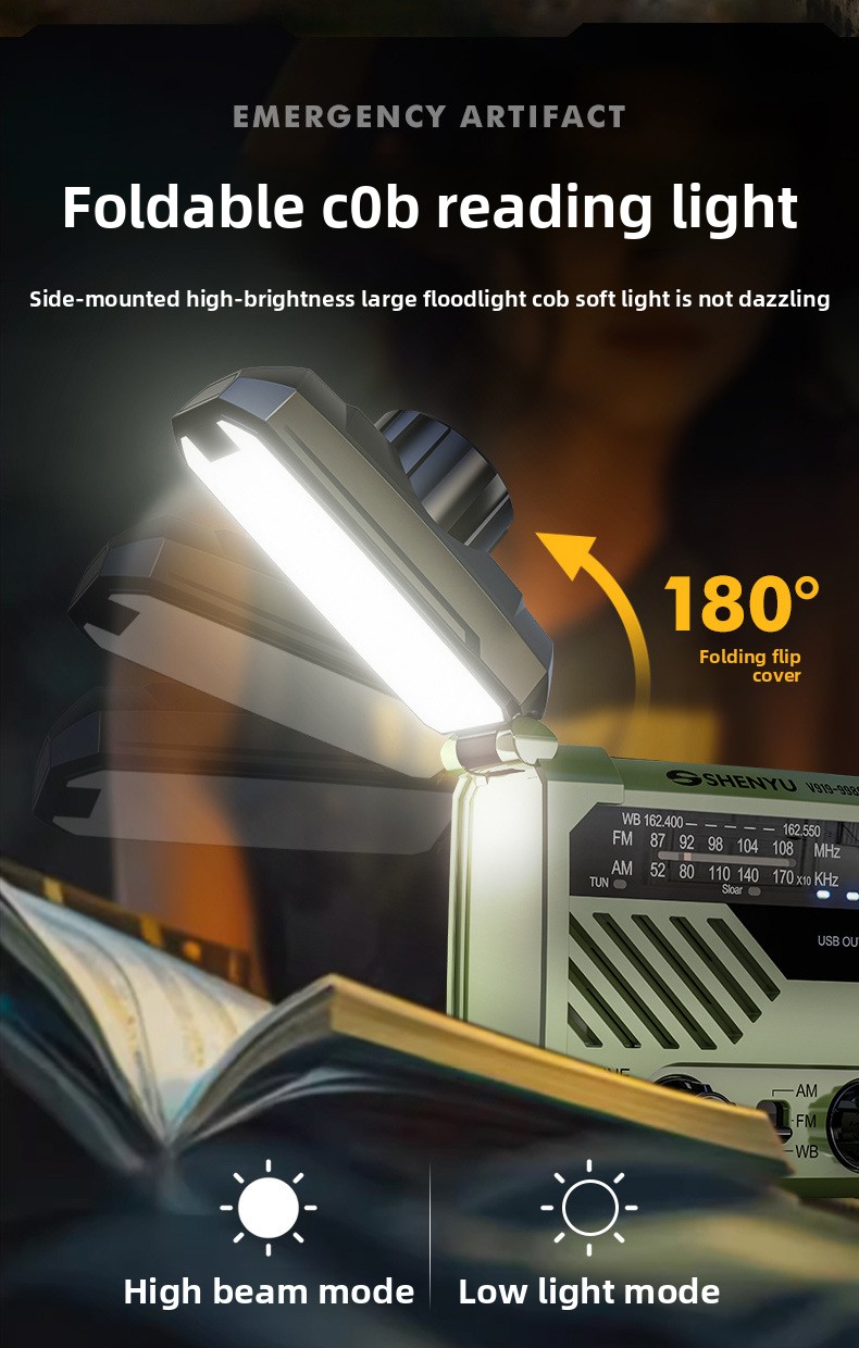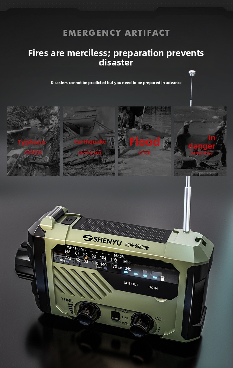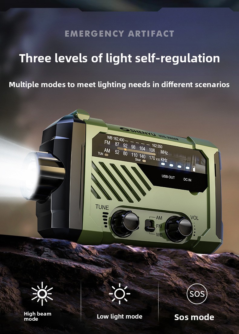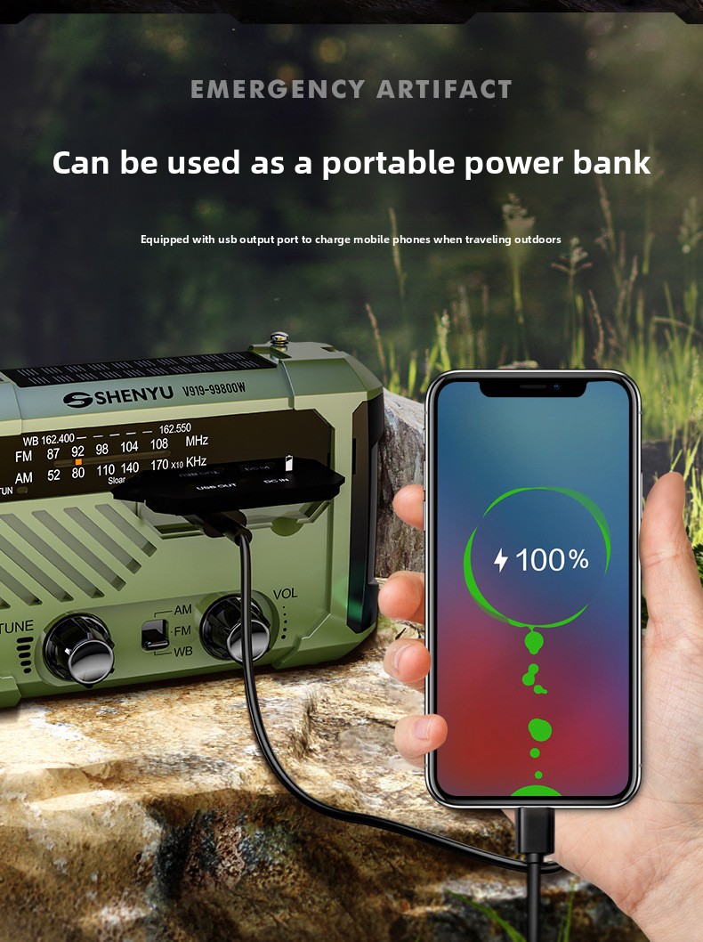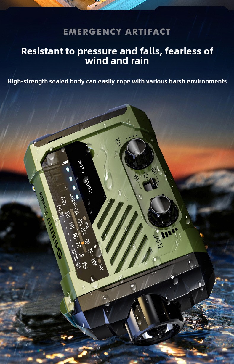 Multi-power charging: Hand crank, solar, Type-C, and AAA battery options for versatile energy sources